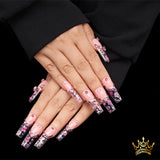 3D Dried Flower Accents – Beautiful pink and purple dried flowers are set within the nails, capturing the dreamy essence of cherry blossoms in spring.