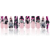 Each nail is heavily embellished with large rhinestones, black 3D flower appliqués, pearls, silver studs, and crystal clusters.