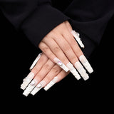 The high-gloss white sculpted tips outline the nails with a frosty elegance, enhancing the 3D texture while maintaining a polished and regal winter queen vibe.