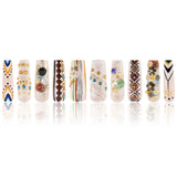 "Tribal Glimmer" is a luxurious nail art collection that fuses ancient tribal aesthetics with modern glamour. Each nail design showcases a unique blend of traditional motifs and sparkling embellishments: