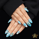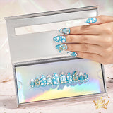 Some nails have a gradient sparkling effect, transitioning from silver to blue, adding a sense of mystery and movement.